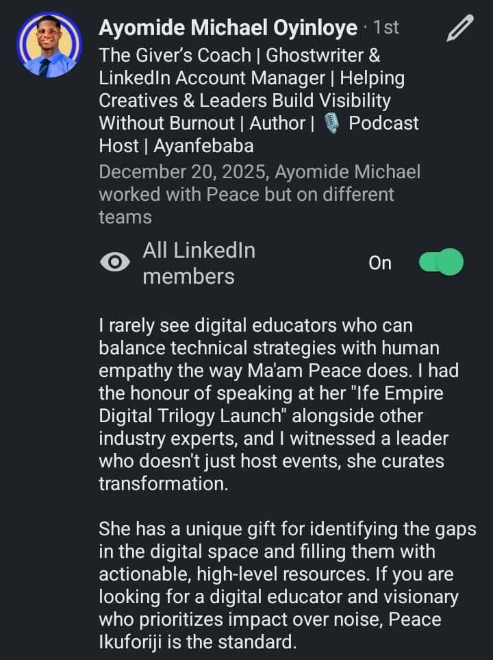 I’m Peace Ifeoluwa Ikuforiji, an educator, techpreneur, and founder of Ife Empire Integrated Services. I help professionals, educators, and creators turn everyday skills into digital power using clear content systems and AI.